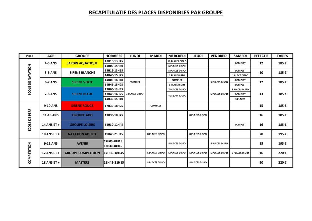 Vous trouverez dans le tableau ci-joint la répartition des groupes ainsi que les créneaux où il reste des places.