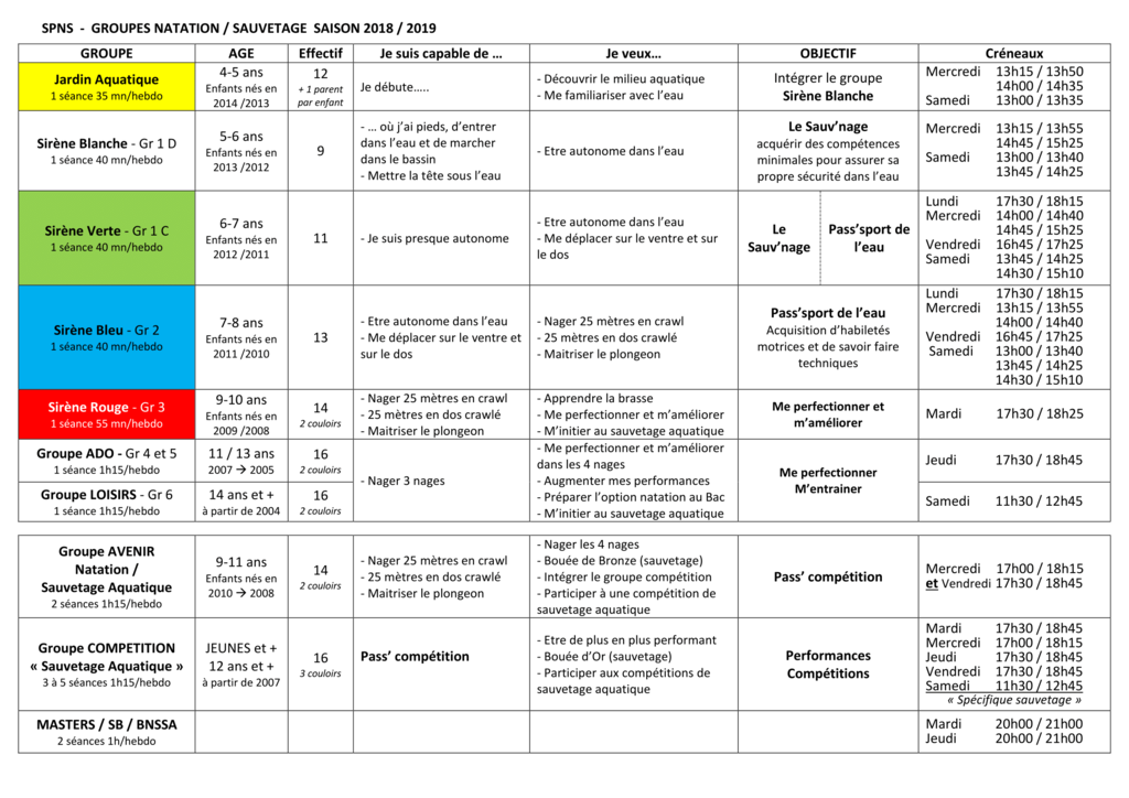 Ce document présente le projet pédagogique de chaque groupe de natation pour la saison 2018-2019
